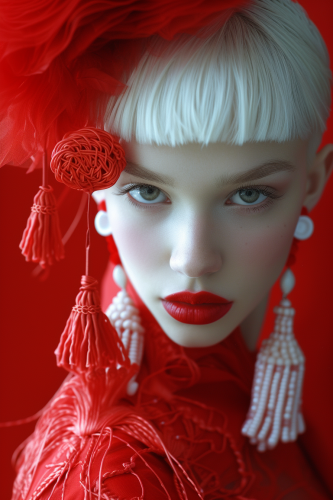 high fashion, cover photo,albino girl,with unusual hairstyle,unusual clothes,very beautiful, extremely attractive eyes, white eyelashes,hypereffectedly extravagant lady of creative appearance, straight black hair, perfect image, voluminous earrings, masterpiece of beauty, fractal colors, juicy red, impeccable style, professional photo, professional photo, 64k, --v 6.0 --ar 2:3