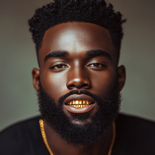 A black man with a beard and calm expression. He has close cut fine, silky hair and a perfect GOLD GRILL on his teeth. The overall vibe is Mafia style.