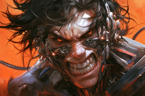 close up of a face of a man with messy black hair with a cybernetic metal mask on the bottom half of his face screaming + horror + art style of Capullo, Brom, Whelan, aly fell rutkowski, art germ, rossdraws, and franzzeta + art station + ultra detailed + hyper realistic + 8k --ar 3:2 --niji 6