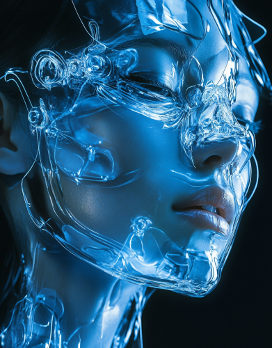 glow in dark , robotic face made out of transparent plastic and chrome details, minimal design style, Yasutomo Oka, black background, dark blue tones, minimalism, by kinko ching, by Katsuya Terada, by Ryohei Hase, by Tetsuo Hara, by taja gangTicket art style, double exposure, ghost effect, hazy --ar 25:32