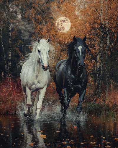 create a mysterious and beautiful night, two horses, one black and one white, in Renaissance style, are galloping freely and lively , captured in dramatic, painterly light with meticulous detail into a haunting elegance, reflections of the moon and the starry sky shredding light to the surrounding beautiful Nordic nature in warm autumn colors, a full body portrait inspired by Man Ray's visionary photography, the reflection is amazing beautiful, --ar 4:5 --s 500 --p teqj53c