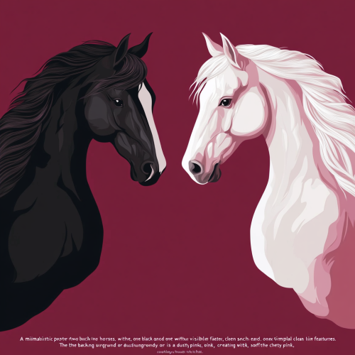 "A minimalistic poster featuring two horses, one black and one white, without visible facial features. The horses are facing each other, depicted with simple, clean lines. The background is a rich burgundy or dusty pink, creating a soft contrast with the horses. The design focuses on simplicity and elegance, highlighting the natural forms of the horses without any unnecessary details."