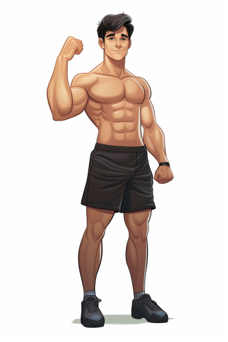a man with cap, headphone, dark colored midriff-baring T-shirt , shorts with inner shorts, muscular thighs and triceps, is listening iphone, proud,shaved sides look, thick eyebrows, miracle eye power, inside gym, japanese banana fish anime style --ar 1:1 --v 6.0