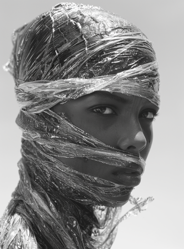 a cover magazine style like Rick Owens editorial feature by Fabien Baron with styling from Miguel Enamorado with a full body view model woman wrapped in transparent plastic foil, wearing a black dress posing for the camera, fashion style, expressive, front view, stunning, model photography, fashion editorial, minimalistic composition, avant-garde, creative, full-body shot, neutral background, photographed from the front view, low contrast, hyper-realistic photography, black and white by Rick Owens, style raw. --ar 14:19 --v 6.0 --s 750
