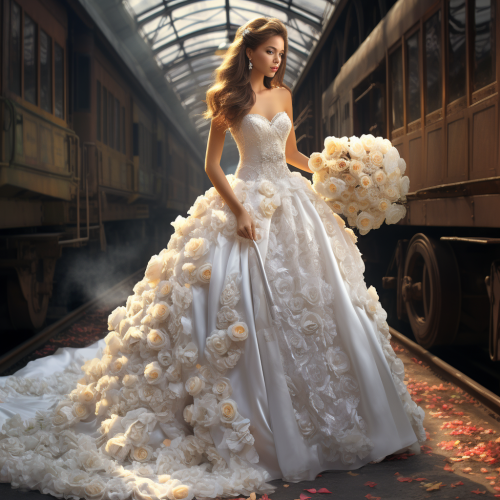 wedding dress, bottom is satin ballgown, the bodice is shaped like a white lily with pistils made of pearls, very minimalist style dress, black model, white studio background