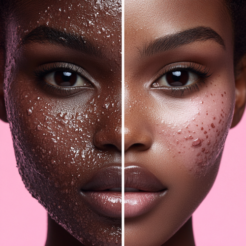 a gorgeous African model beautiful eyes with uneven rough skin and spots on the left and on the right is clear beautiful glowing skin in a before after visual on pink