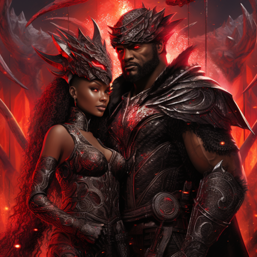 Create a ultra photorealistic intricate detailed full length illustration of a African American couple. The tall muscular man is dragon devil mix wears a black crown with red jewels with skin made of ash and neon red and neon orange lava, he has large black textured horns, he wears black metal medieval armor with a leather handle sword the blade made of metal, ash and glowing lava. The curvaceous woman has long gray hair with tattoos made of glowing lava, she’s wearing black and red beaded covering and a black crown accented with red jewels and red high boots. The embrace walking through black Smokey city of darkness engulfed in flames. Black rock cliffs and lava waterfalls in a distance