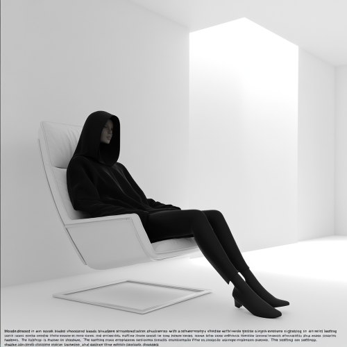 "Model dressed in an oversized black hoodie with structured shoulders, sitting in a single white leather chair in an otherwise empty, infinite white room. The lighting is soft and even, casting no shadows. The setting emphasizes the luxurious minimalism of the outfit and the tranquility of the open space."