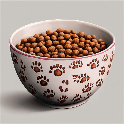 high detailed photorealistic watercolor beautiful bowl, full bowl of cat food, brown granules, beautiful bowl with cat paw design all over the bowl, cat bowl, beautiful illustration with realistic details, high resolution, gray background