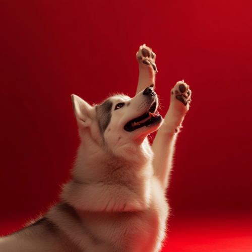 A happy strong husky. Sit on floor. with a paw up. Elegant. Minimal style. Three flashlight sources. Gradient light background. Magazine photo. Red plain background. Photo direction. Art direction.