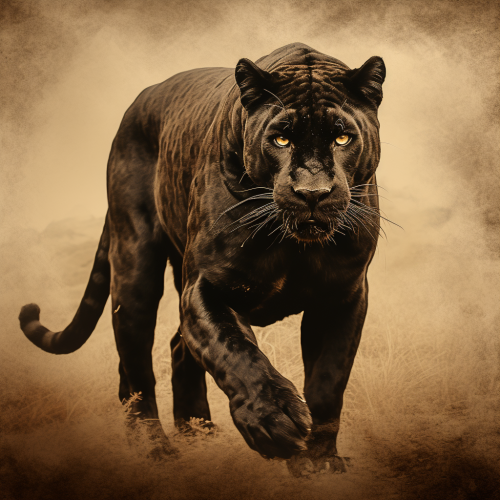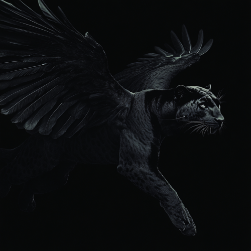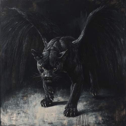 A painting of a panther with black feathered wings in an all-black style, showing its full body in a dynamic pose. The panther's muscular form is highlighted through subtle lighting, emphasizing its powerful muscles and sleek build, while its large, black feathered wings extend gracefully from its back. The wings are detailed with individual feathers, blending into the darkness while still visible through soft, faint highlights. The background remains dark and minimalistic, enhancing the focus on the panther's majestic form with wings, creating a sense of strength, mystery, and a mythical, otherworldly atmosphere.