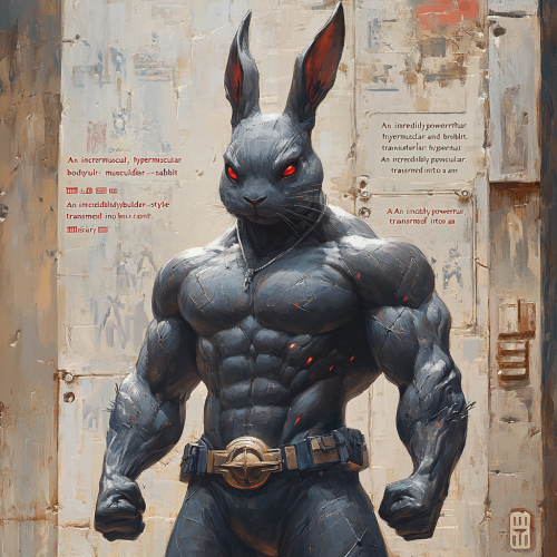 "An incredibly powerful, hypermuscular and bodybuilder-style rabbit transformed into a "An incredibly powerful, hyper-muscular, bodybuilder-style rabbit transformed into a Black Panther, standing in a full body pose with an immensely strong and dominant presence, Facing forward. The rabbit’s body is bulky in extreme proportions, with overworked muscles visible under a tight suit exclusive to the "An incredibly powerful, hyper-muscular, bodybuilder-style rabbit transformed into a "An incredibly powerful, hyper-muscular, bodybuilder-style rabbitBlack Panther, standing in a full-body pose with an immensely strong and dominant presence, facing forward. The rabbit’s body is bulky in extreme proportions, with overworked muscles visible under a tight suit unique to the "An incredibly powerful, hyper-muscular, bodybuilder-style rabbit transformed into a black panther, standing with a full body posture with an immensely strong and dominant presence, facing forward. The rabbit’s body is bulky in extreme proportions, with overworked muscles visible under a tight suit exclusive to the Black Panther. The costume is designed to emphasize the rabbit’s chest, arms and legs, with intricate details like arcane symbols and bright patterns pulsing with mystical energy. The rabbit’s thick and deer arms are raised with his powerful hammer, his hands shining with a chaotic red energy, ready to unleash powerful spells. His posture is broad and confident, with the heavily muscular legs firmly planted on the ground, exuding strength and mystical power. with its large muscular neck that supports it and the ears that stand out among the cracks of the piece. The rabbit’s eyes glow red with intense magical energy, caught in front of a fierce and determined look. The background is a typical [...]