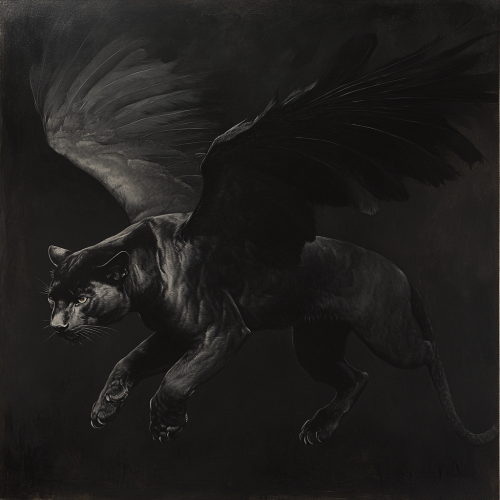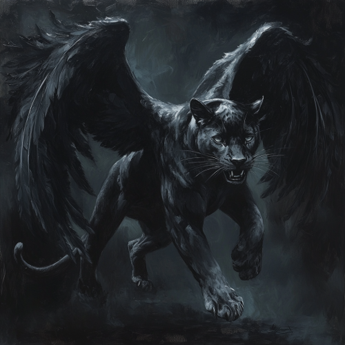 A painting of a panther with black feathered wings in an all-black style, showing its full body in a dynamic pose. The panther's muscular form is highlighted through subtle lighting, emphasizing its powerful muscles and sleek build, while its large, black feathered wings extend gracefully from its back. The wings are detailed with individual feathers, blending into the darkness while still visible through soft, faint highlights. The background remains dark and minimalistic, enhancing the focus on the panther's majestic form with wings, creating a sense of strength, mystery, and a mythical, otherworldly atmosphere.