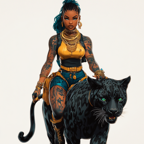 QUEEN wearing haute couture dresses, The Queen with her loyal Black Panther companion beside her, which is three times larger than her - Egypt, Realism, Full Body, Ancient, Bokeh Effect, Gold Jewelry, Linen, Hieroglyphs, Desert Beige, Gold, Valentino, Bright, Sunlit, Desert Ruins, Noon, Mysterious, Vast Desert, Golden Necklace, Anklet --ar 9:16