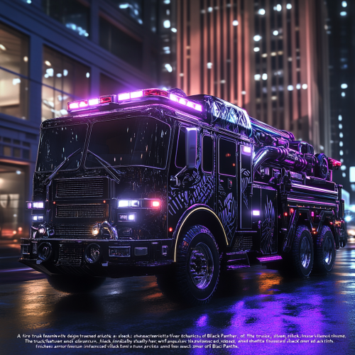 "A fire truck transformed with the design and characteristics of Black Panther. The truck features a sleek, stealthy black and silver color scheme, with sharp, angular lines and matte finishes resembling the advanced, vibranium-infused armor of Black Panther. The body is streamlined, with subtle tribal patterns etched into the sides, evoking the rich culture of Wakanda. The headlights glow a soft purple, symbolizing the energy of vibranium, while other parts of the truck emit a faint purple glow, representing the kinetic energy absorption of Black Panther's suit. The truck’s mechanical parts are visible in places, showcasing a combination of advanced Wakandan technology and strength. The scene is set in a modern urban cityscape at night, with tall, futuristic skyscrapers illuminated in the background. The wheels are large, with silver claws integrated into the design, and parts of the vehicle glow with a purple hue, emphasizing its stealth, speed, and advanced technology." --v 6.1 --s 250