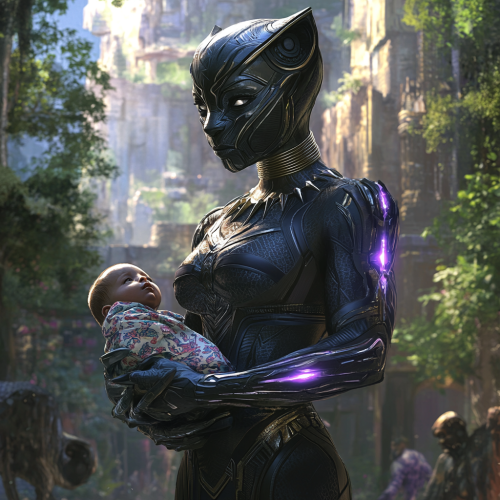 A female version of Black Panther, embodying grace, strength, and the protective instincts of a mother. Her vibranium suit is redesigned with elegant, flowing lines that reflect both the power of the panther and the nurturing role of motherhood. She stands tall, holding a baby wrapped in a traditional Wakandan-patterned cloth, with subtle purple energy lines pulsing through her suit. The background is the royal palace of Wakanda at dusk, with towering futuristic buildings surrounded by lush jungle, bathed in the warm glow of the setting sun.cinematic,high quality.