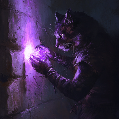 A female panther-tabaxi-person, with black fur, burned face, scarred fur, trying to extract a purple-glowing-crystal from a dark wall. Fantasy character art.