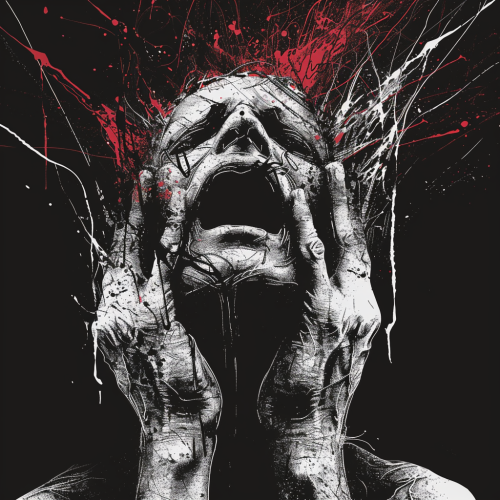 Creepy grotesque horror image of a man ripping his face off. Surreal, scratchy with minimal colour sketch. Black and red.