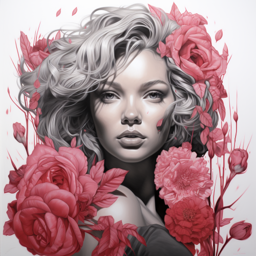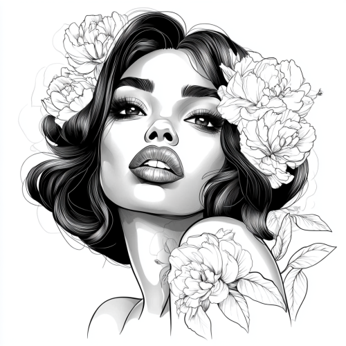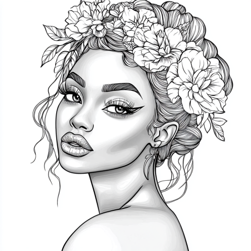 coloring book style, black and white color, picture, black beautiful woman with makeup, puffy lips, beautiful hairstyle, with flowers in her hair, white background --v 6.1