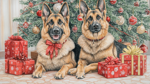 beautiful coloured hand drawn very detailed picture of two Big beautiful happy German shepherd dogs sitting down in front of a beautiful decorated Christmas tree with beautiful wrapped Christmas Boxed presents with bows on them, coloured pencil drawn, detailed, Christmas --ar 16:9 --v 6.1