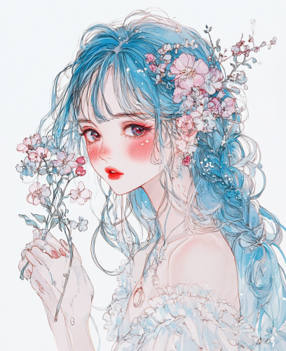 A girl with blue and pink hair, red cheeks, white dress, holding flowers in her hand, in the style of manga, colorful ink drawings with light gray and dark cyan tones, half body portrait with a white background, in . --ar 105:128 --v 6.1