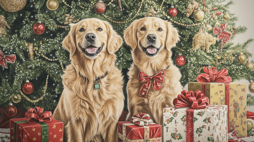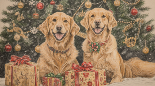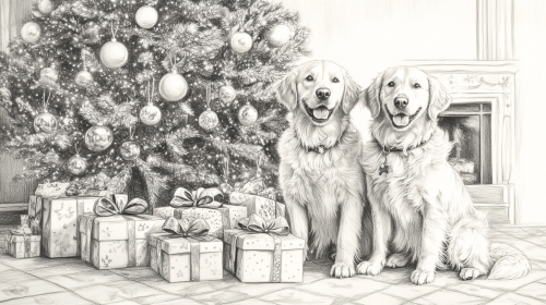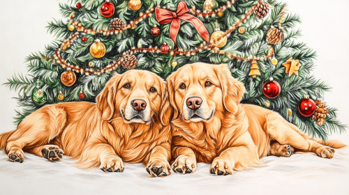 beautiful colored hand drawn very detailed picture of two Big beautiful happy golden retriever dogs lying down in front of a beautiful decorated Christmas tree, colored pencil drawn, plain background, Christmas --ar 16:9 --v 6.1