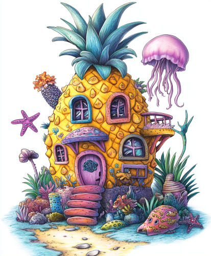 the pineapple house from Spongebob square pants hand-drawn in colored pencil, in the style of Nickelodeon cartoons, white background three color limit, starfish, jellyfish, snails, and drawn to appeal to twelce year old children, t shirt design --ar 5:6