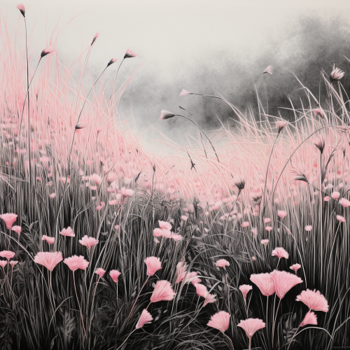 beautiful grass field, falling pink flowers mixed wth black and white pencil sketch