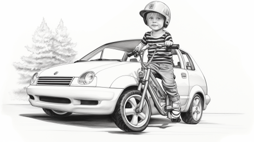 a black and white detailed pencil sketch of a kid riding a bmx bike looking at a 2004 Volkswagen R32 in the pacific northwest, --ar 16:9