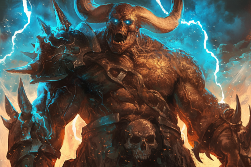 close up of giant muscular monster with a bone exoskeleton armor and a evil skull head laughing during a thunderstorm + horror + art style of Capullo, Brom, Whelan, aly fell rutkowski, art germ, rossdraws, and franzzeta + art station + ultra detailed + hyper realistic + 8k --ar 3:2 --niji 6