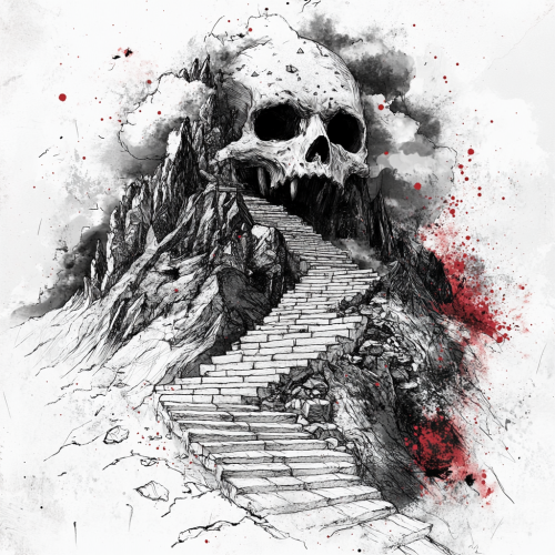 A dramatic apocalyptic scene of a massive storm in the shape of a skull, its eye sockets radiating with fiery spirals of energy. Dark clouds swirl violently around the skull, stretching outward in ominous spirals. Below, towering high-voltage transmission lines stand against the storm, their silhouettes dwarfed by the overwhelming power above. Fiery flashes of red and orange illuminate the clouds, casting an eerie glow over the landscape, symbolizing the raw intensity and danger of high-voltage energy --ar 16:9 --v 6.1