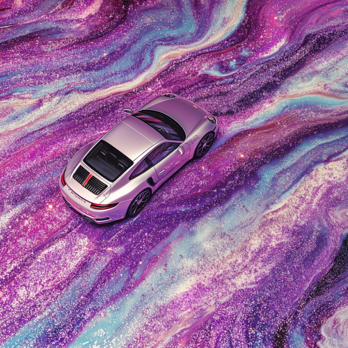 realistic hyperealistic top angle closeup shot of superdetailed marble wallpaper that features shiny purple glitter, a shining Porsche 911 parking on top, in the style of crystals, close-up, fanciful, dreamlike imagery, purple, flowing fabrics, eye-catching resin jewelry, and cute and dreamy hdr --v 6.1