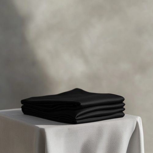 mens black tight chino trousers folded on a table, the fabric tight and form-fitting, showcasing the sleek design and premium craftsmanship. The table is positioned in front of a light grey background, creating a minimalist yet elegant setting that emphasizes the trousers’s silhouette. The shirt’s surface catches the soft, diffused light, highlighting the fine details and texture of the material. Volumetric lighting adds a subtle glow, enhancing the luxurious feel of the product. Photographed by Steven Meisel with a Nikon D850, Award-Winning Photography style, Volumetric lighting, 8K, Ultra-HD, Super-Resolution. --v 6.1