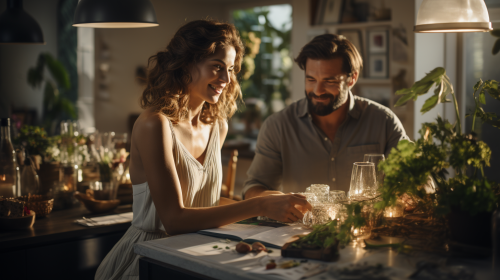 Cinematic photography, in the foreground: a premium cardboard box in the colors green and white are standing on a kitchen island inside a modern kitchen, in the background: a family is sitting together are having dinner together at a wooden table, afternoon sunlight, shot on 35mm Kodacolor, detailed photography --ar 16:9 --s 750 --style raw