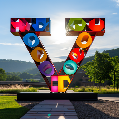 a giant Robert Indiana sculpture using letters Y E S X against blurred outdoor background