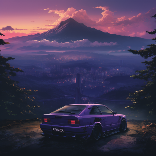 phonk album cover art of a midnight purple nissan silvia drifting on the top of a mountain overlooking tokyo