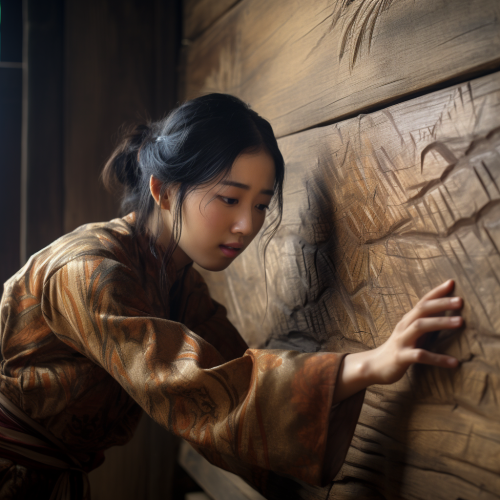 A young Japanese woman in pretty everyday clothes touching the texture of wood with her hands
