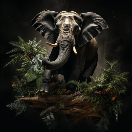elephant skiing and crashing into a tree, and wrapping around the tree on a solid black background, photorealism