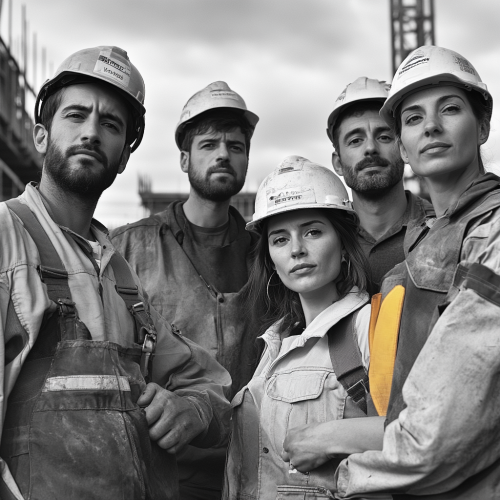 black and white photo of smiling man in hard hat, construction site, worker behind him, medium shot, 35mm lens, f/2.0 aperture, shutter speed value, ISO 480, studio lighting, soft light source, rule of thirds composition, highly detailed, hyper realistic, cinematic photography, --ar 128:85 --v 6.0