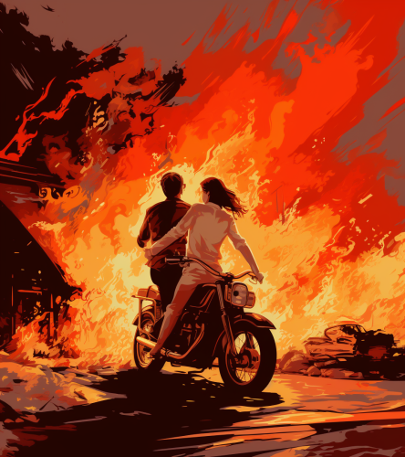 the bike is on fire and two people are on the bike with a car on fire, in the style of butcher billy, symbolic objects, light beige and red, apocalyptic, contained chaos, darkest academia, symbolic props --ar 113:128