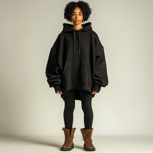 "Model dressed in an oversized black hoodie with structured shoulders, sitting in a single white leather chair in an otherwise empty, infinite white room. The lighting is soft and even, casting no shadows. The setting emphasizes the luxurious minimalism of the outfit and the tranquility of the open space."