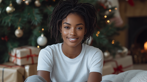 T-shirt mockup,Mockup of happy black woman wearing gray sweatpants and white t-shirt, t-shirt front is clearly visible and spread, sitting on sofa near christmas tree with gifts behind her back, stylized as aesthetic fashion photography setting, christmas mood, natural light, detailed skin texture, full length portrait, neutral tones, christmas themed background, lifestyle, professional product photoshoot --ar 16:9 --style raw --s 750