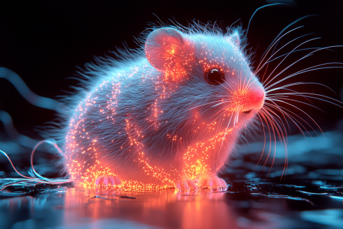 Photo realistic: In a black void lives a 3D geometric hybrid hamster, constructed of fluorescent neon optic fibers, --chaos 10 --v 6.1 --style raw --s 1000 --ar 3:2 --q 2