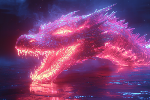 Photo realistic: a 3D geometric hybrid monster, constructed of synthwave neon optic fibers exists In a fluorescent liquid void, --chaos 10 --v 6.1 --style raw --s 1000 --ar 16:9 --q 2