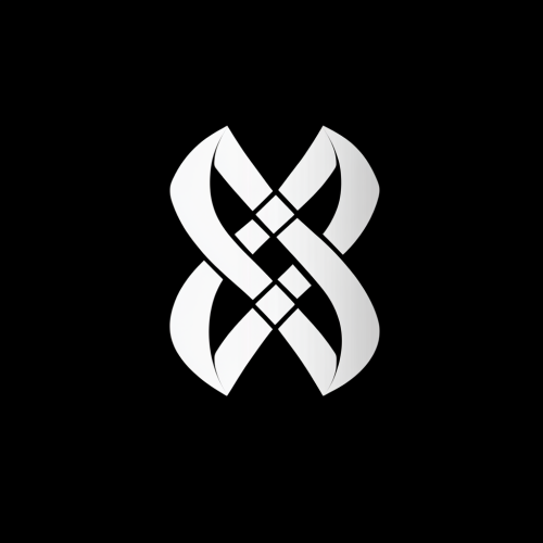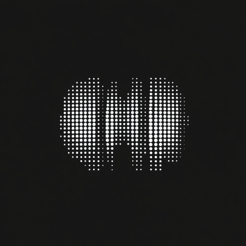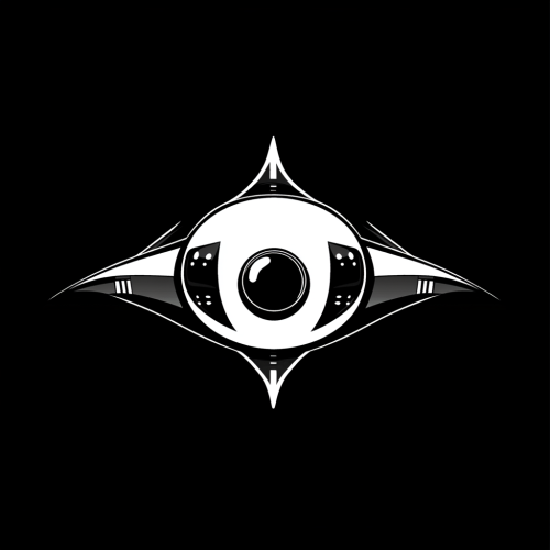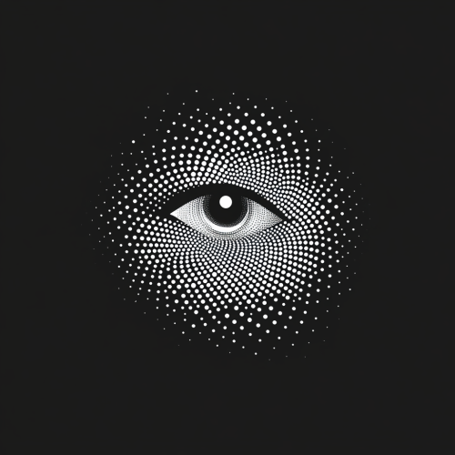 A white vector logo made of dots on a black background, with a simple and minimalistic design. The graphic elements resemble an eye with spirals and dots arranged in the shape of a circle or spiral pattern, inspired by a sleek, modern digital art style. The design features no shadows, high contrast, and uses vector illustration with simple shapes and no gradients, resulting in a vector graphics artwork.