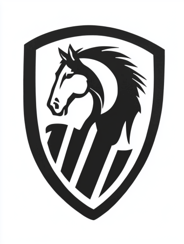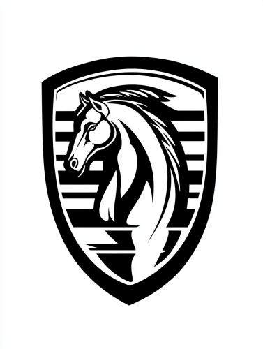 Black-and-white woodcut of a Porsche logo, shield shape with thick bold outline, central stylized horse in silhouette, simplified horizontal bars, emphasis on negative space and texture from woodcut carving, rough, visible lines for a handmade look, strong contrast with no additional colors. --v 6.1 --s 50 --ar 3:4