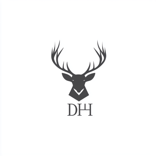 A sleek modern monogram logo blending an elk head with the letters ‘DH’ in a minimalist style, Clean lines and geometric shapes with the elk’s antlers subtly incorporated into the design of the letters