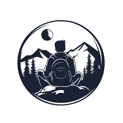 camping logo, vector graphic design with a white background, using simple shapes, depicting a sitting man wearing a backpack and hiking boots, with a silhouette of mountains in the distance and trees around him, looking at the moon,all elements are a solid black color, in a circular shape, in a flat style, it is a minimalistic design with high contrast between the foreground element and the mountain silhouettes, it is professionally designed to be printed on a t-shirt using screen- or stamping printing techniques. No text or other items should be added to this design. --s 50