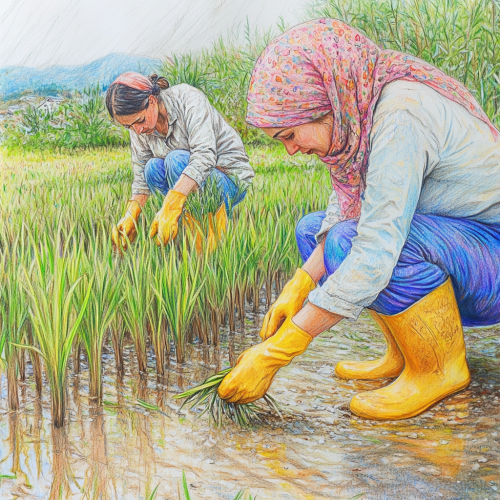 Colored pencil sketch of Iranian farmer people while they are caltivating rice by hands in rice lands, the atmosphere is green and rainy. their outfits are vibrant and colorful, they wear yellow rubber shoes and sloves. The layout of them must be symetric like Wes Anderson's film, which are so neat and symetric--ar 16:9--4K
