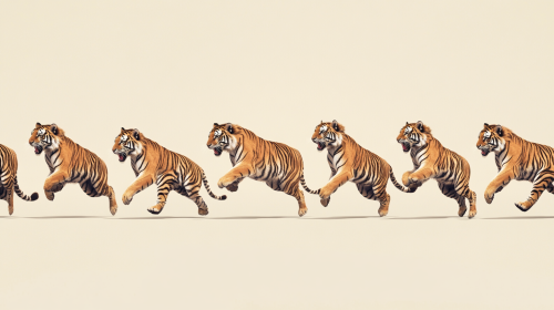 Create a sequence of 8 frames showing the fluid motion of a tiger running, capturing the full range of motion in a single, continuous stride. Each frame should display a distinct phase of the tiger's stride, mimicking the style of 'The Horse in Motion,' with no repeated poses. The tiger should be shown in a side profile, running across a minimal background. The image should be in a 3:1 aspect ratio, with each frame evenly spaced across the width to emphasize the continuous motion --ar 16:9